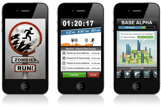 Zombies, Run! es una app para iOS y es una mezcla entre aplicación de deportes y juego de zombies, si, es lo que te imaginas. Tu sales a correr mientras una legión de muertos vivientes te persiguen, te motiva a correr o no. Aunque parezca una autentica locura, funciona, y motiva bastante, ademas de ser una buena aplicación en el tema técnico del entrenamiento y controlar bastante bien nuestro rendimiento, es muy divertida.
